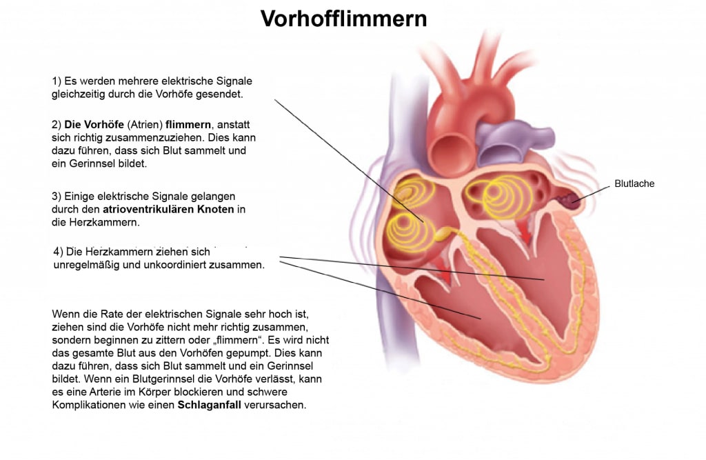 Vorhofflimmern ist eine Herzrhythmusstörung, die in den Vorhöfen entsteht und einen unregelmäßigen und schnellen Herzrhythmus verursacht. Durch die unregelmäßige und schnelle Bewegung der Vorhöfe nimmt die Kontraktion ab, was zu einer Verlangsamung oder sogar einem Stau des Blutflusses führt.