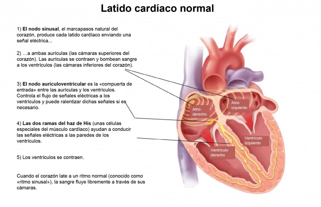 La onda eléctrica se propaga, a través de las aurículas, desde el nódulo sinusal hacia el “nodo auriculoventricular”. Desde este nodo, la onda se extiende hacia los ventrículos y el corazón se contrae para bombear sangre al cuerpo.
